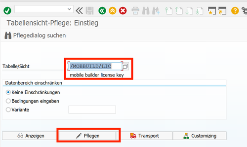 Die Lizenz wird über die Transaktion SM30 - Tabelle "/mobbuild/lic" eingetragen: