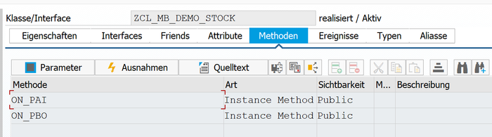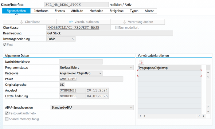 Die erstellte Klasse erweitert die Oberklasse /mobbuild/cl_request_base und erbt deren Methoden. Dabei werden die Methoden on_pbo und on_pai in der neuen Klasse redefiniert, um benutzerdefinierte Logik zu implementieren.